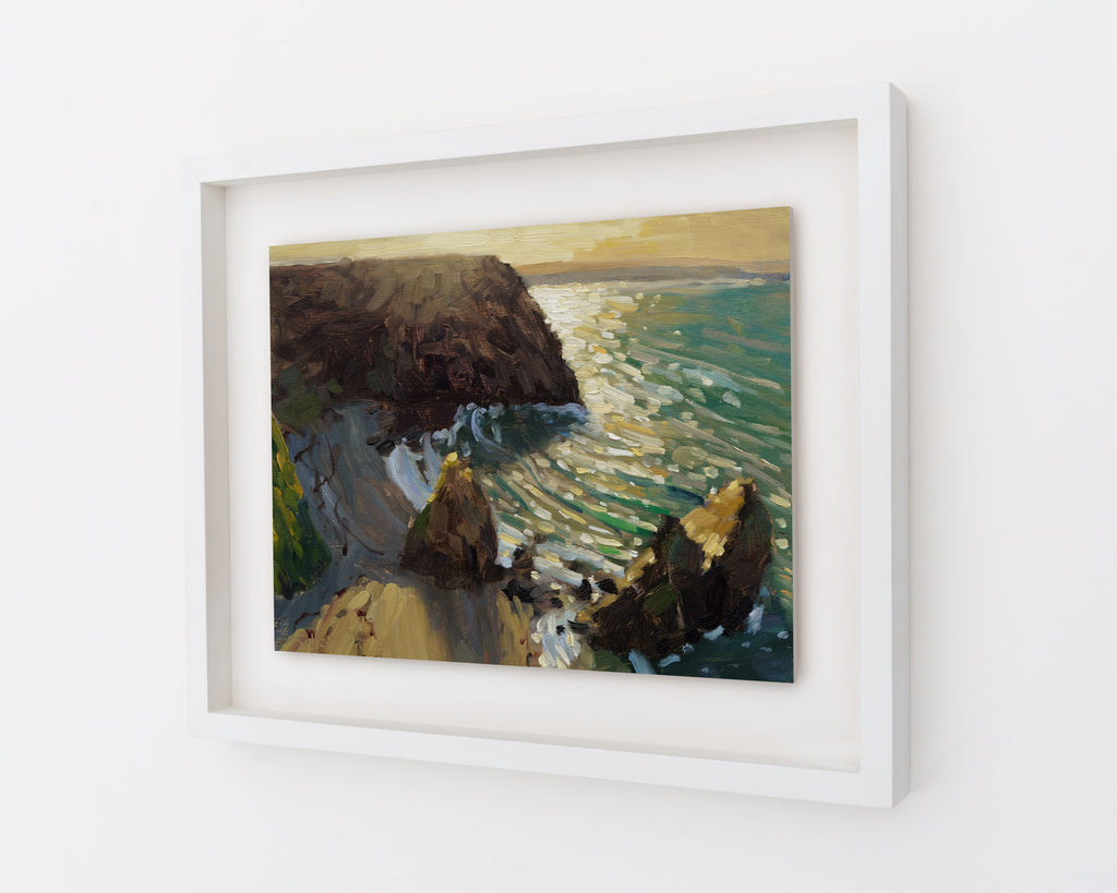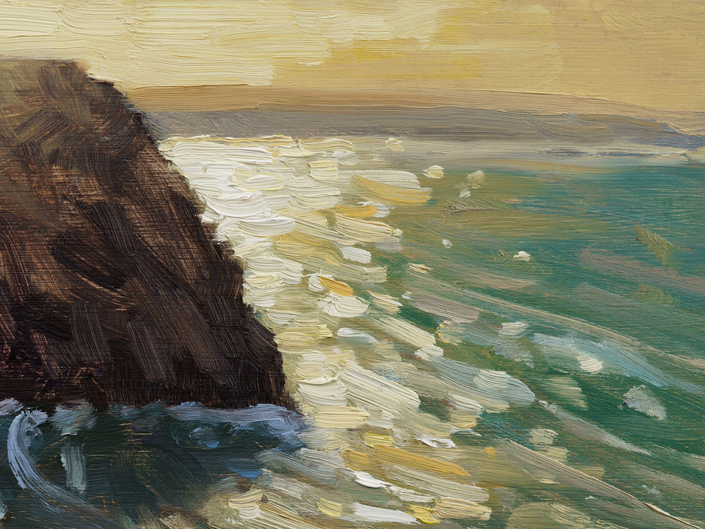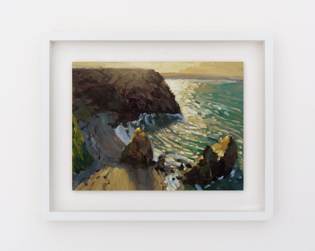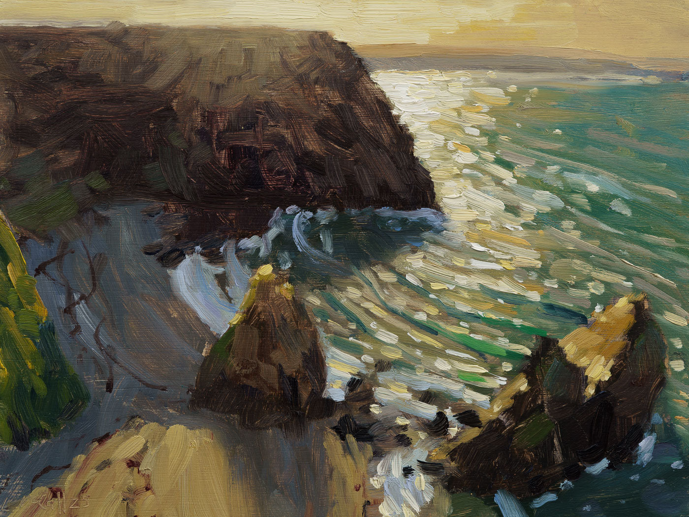 Painted looking southward as the afternoon light reflected off the sea. This cove is inaccessible by foot and a safe haven for many seabirds