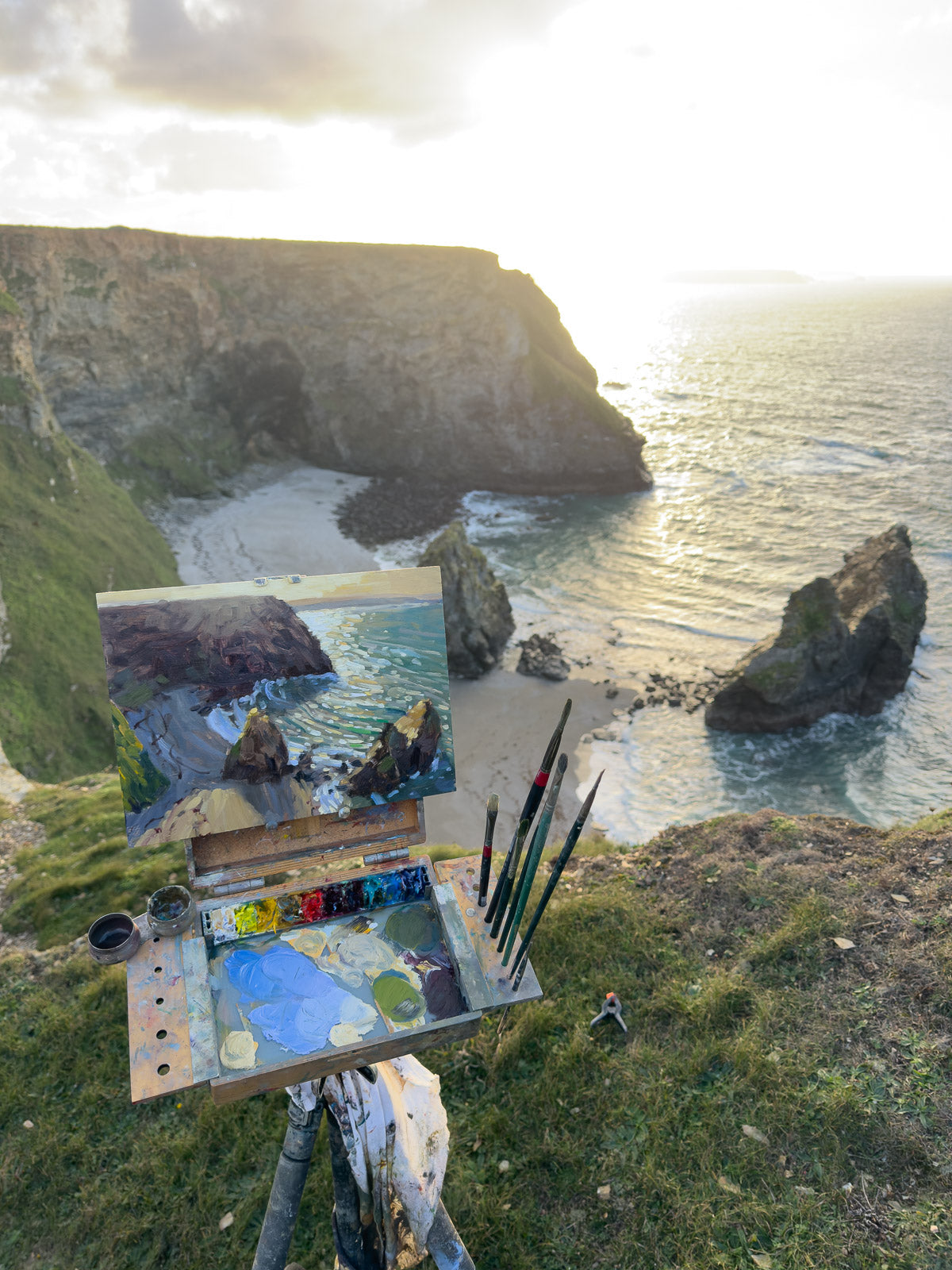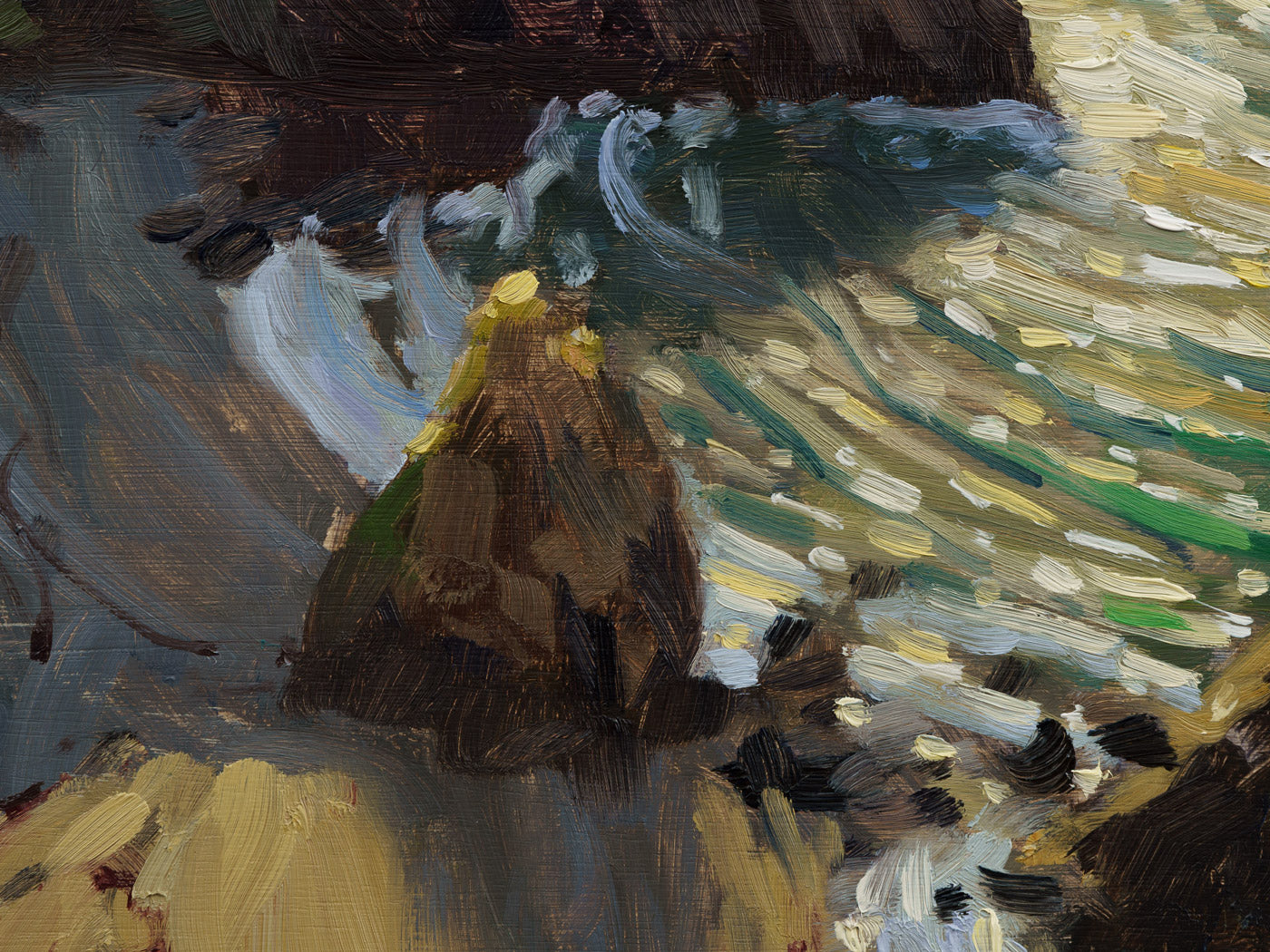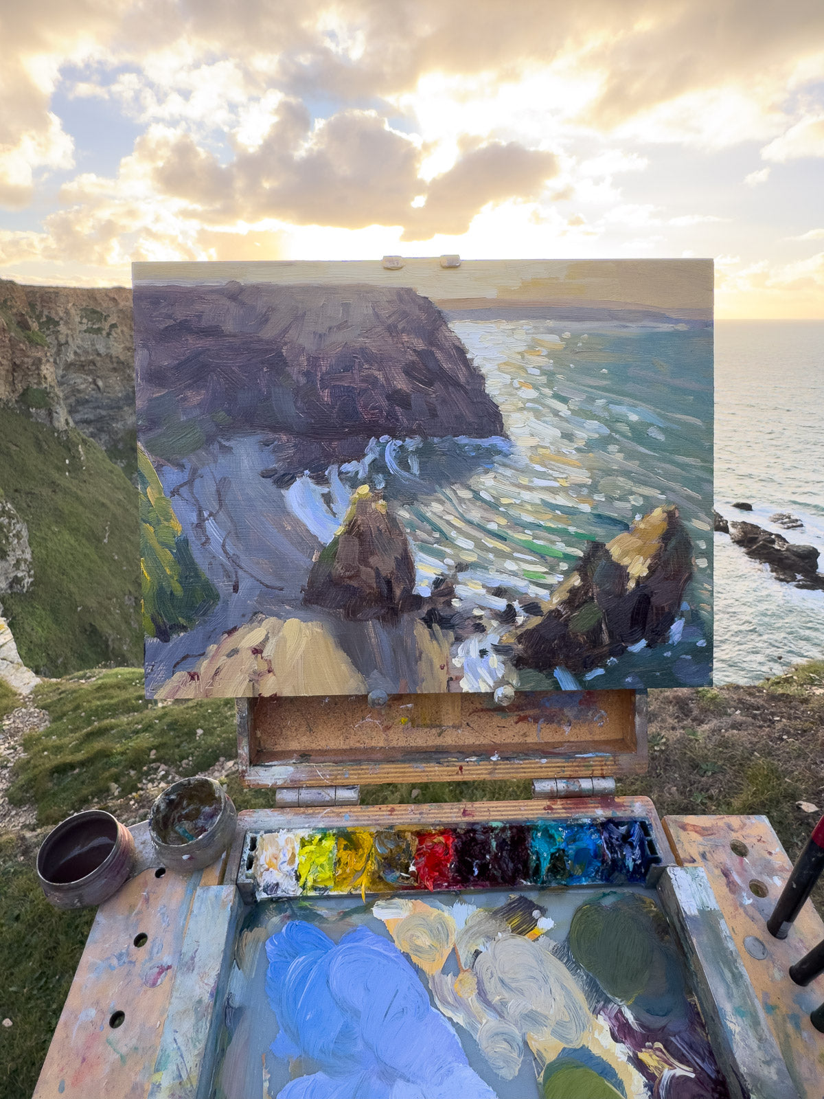 Painted looking southward as the afternoon light reflected off the sea. This cove is inaccessible by foot and a safe haven for many seabirds