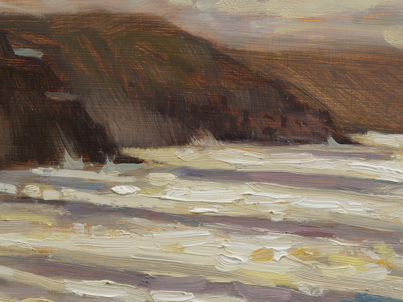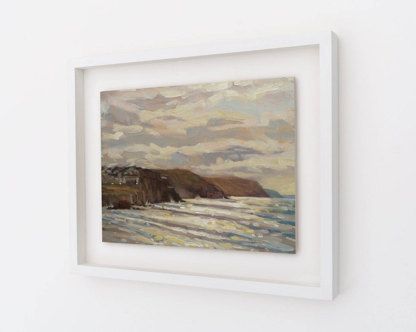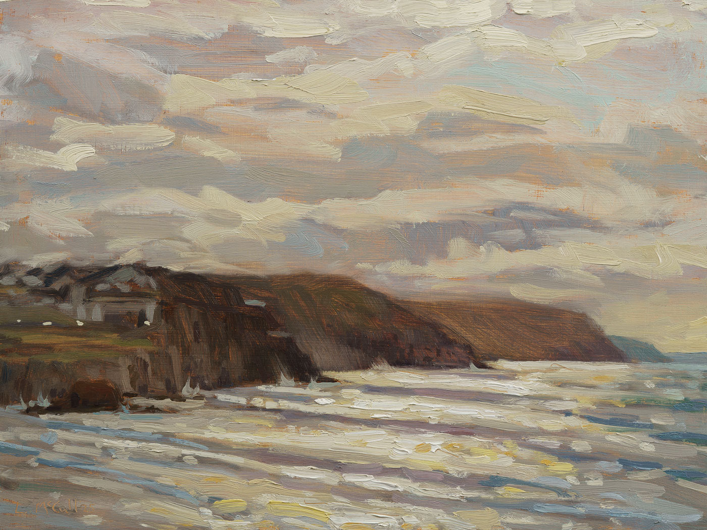 Painted 'en plein air' from the dunes, looking across Perranporth Beach to Droskyn. Low afternoon sunlight peaked through the clouds and reflected off the choppy sea.