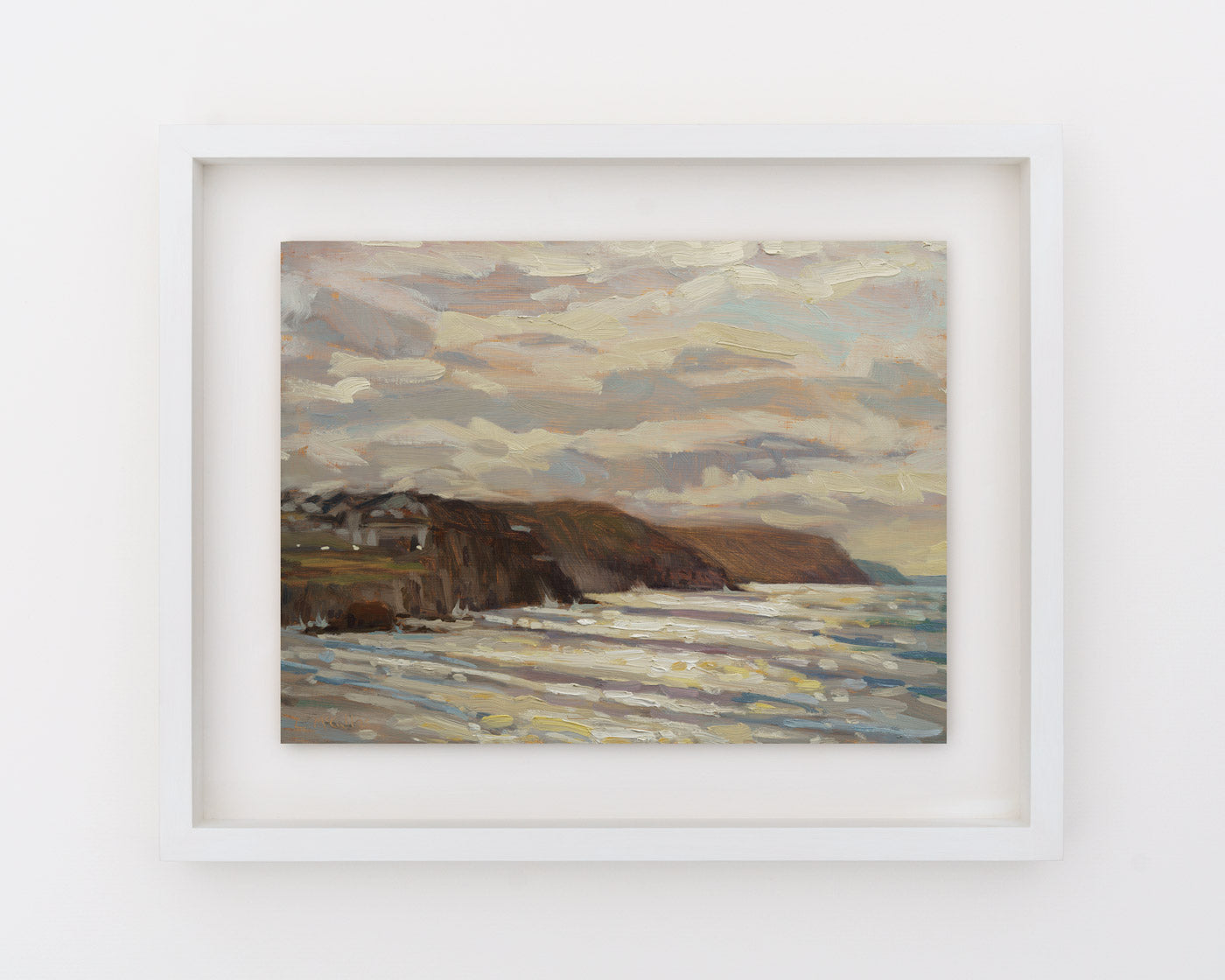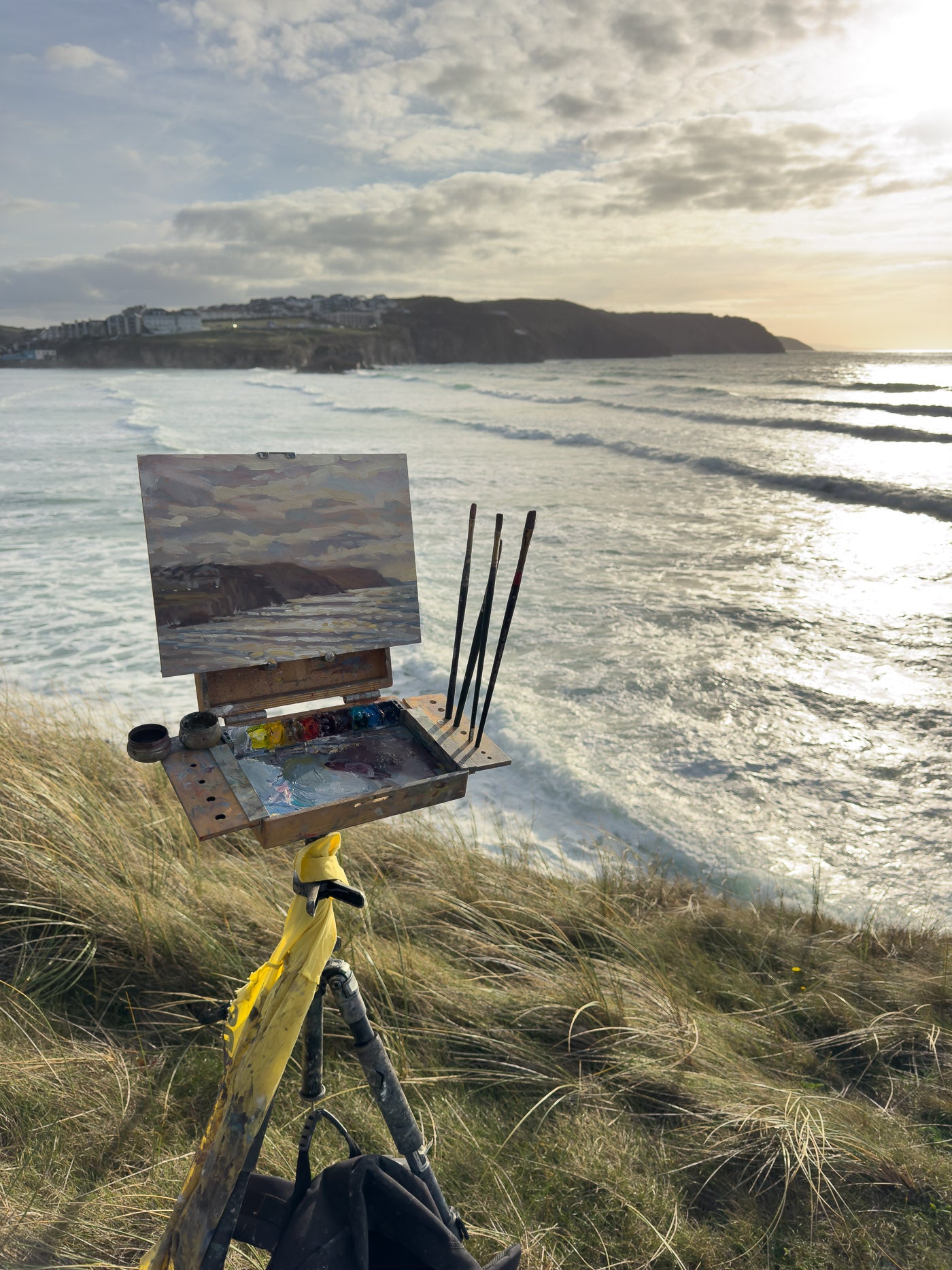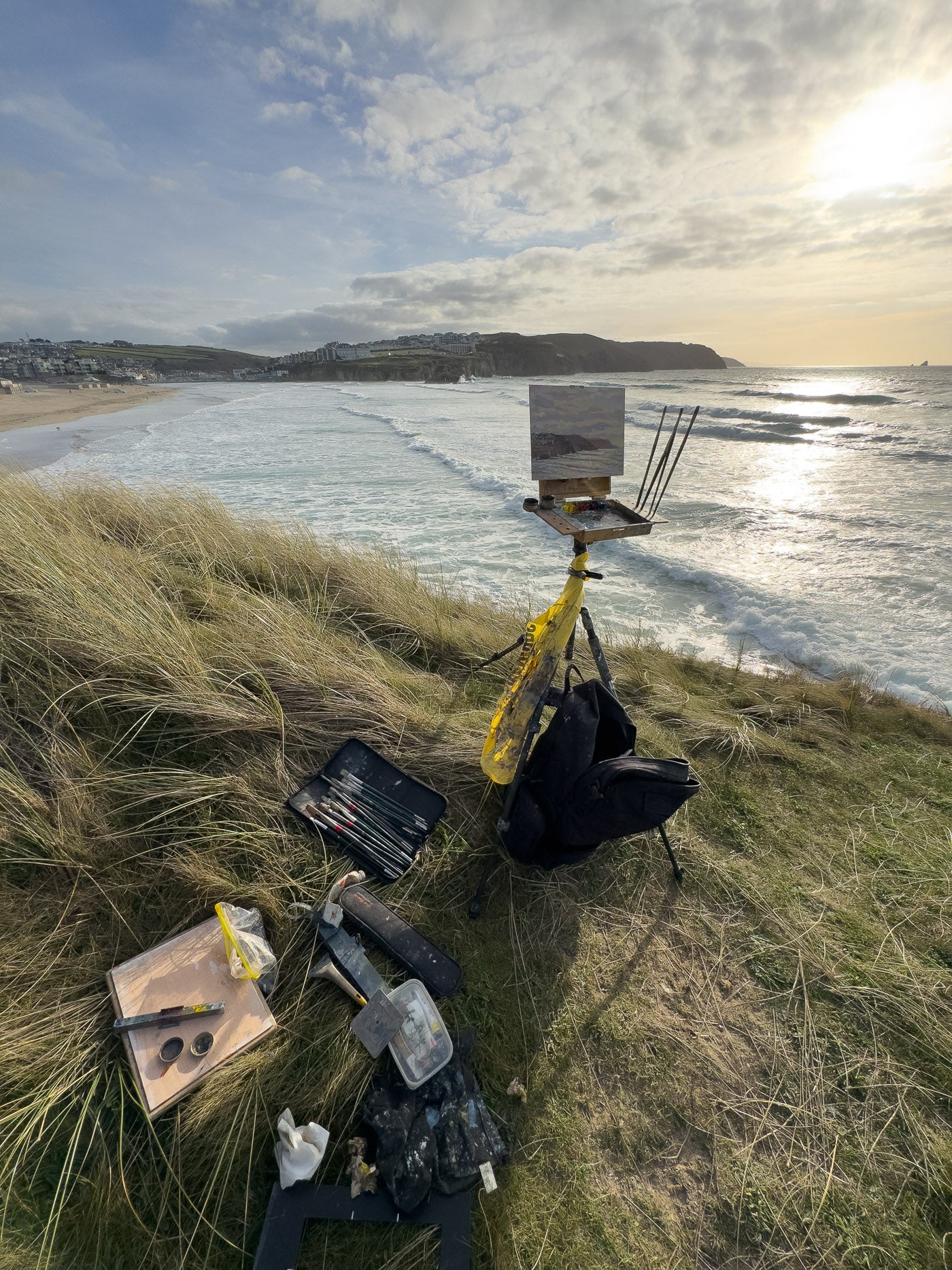 Painted 'en plein air' from the dunes, looking across Perranporth Beach to Droskyn. Low afternoon sunlight peaked through the clouds and reflected off the choppy sea.