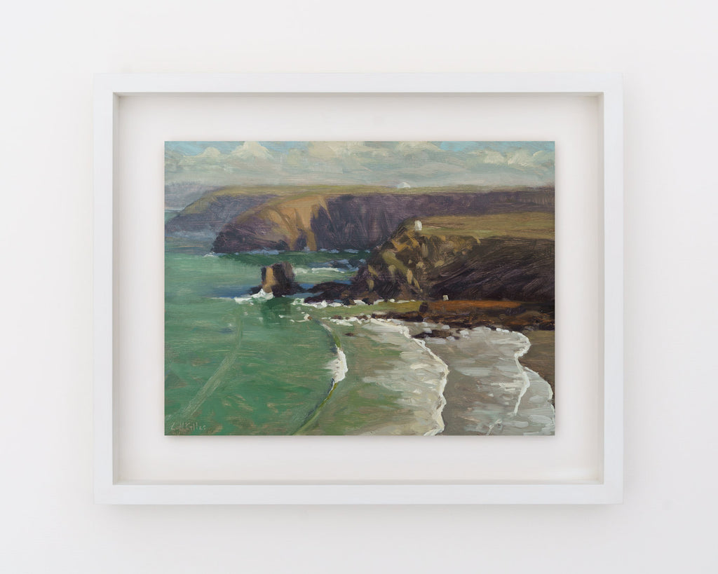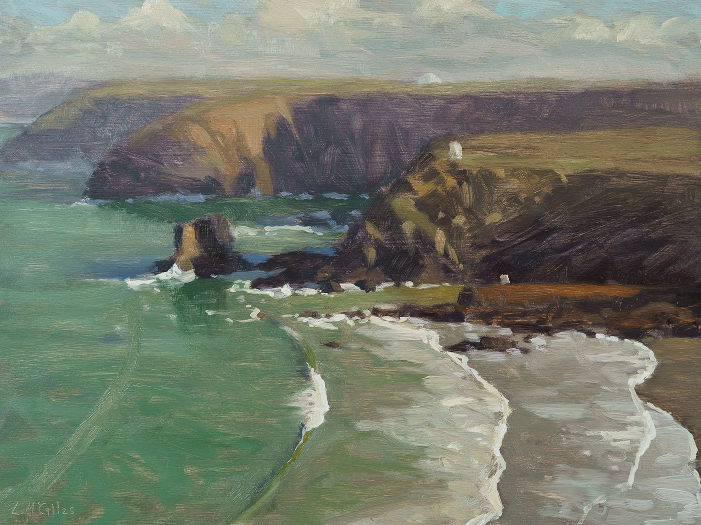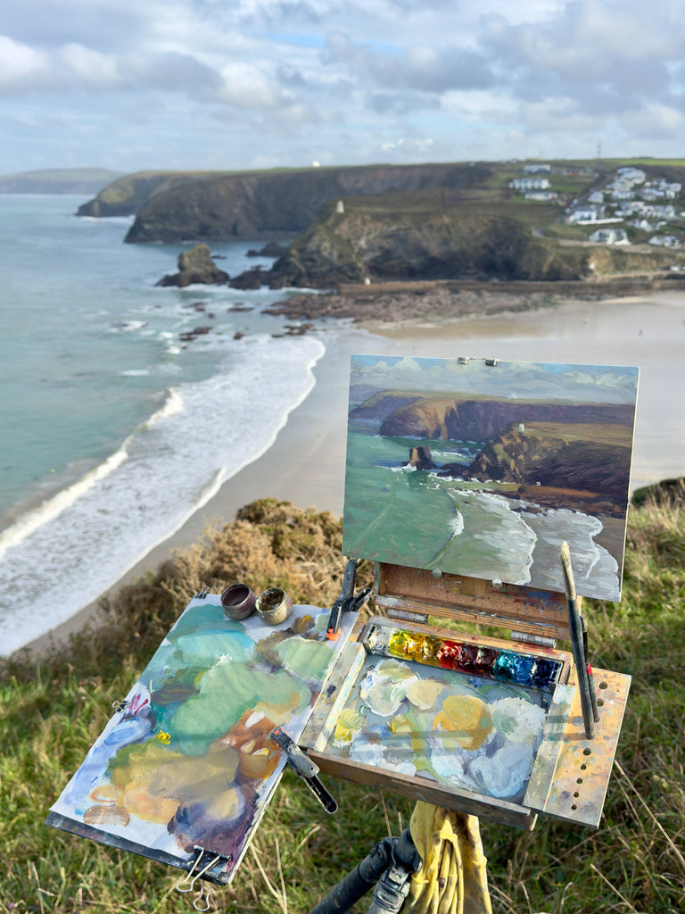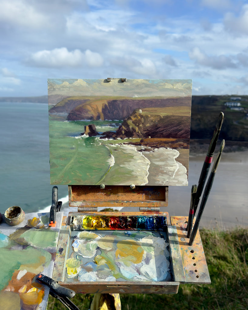 A clean swell rolls in at low tide, Portreath, Cornwall. The cliffs cast shadows in the morning light. Painted en plein air from the cliff top overlooking the beach.