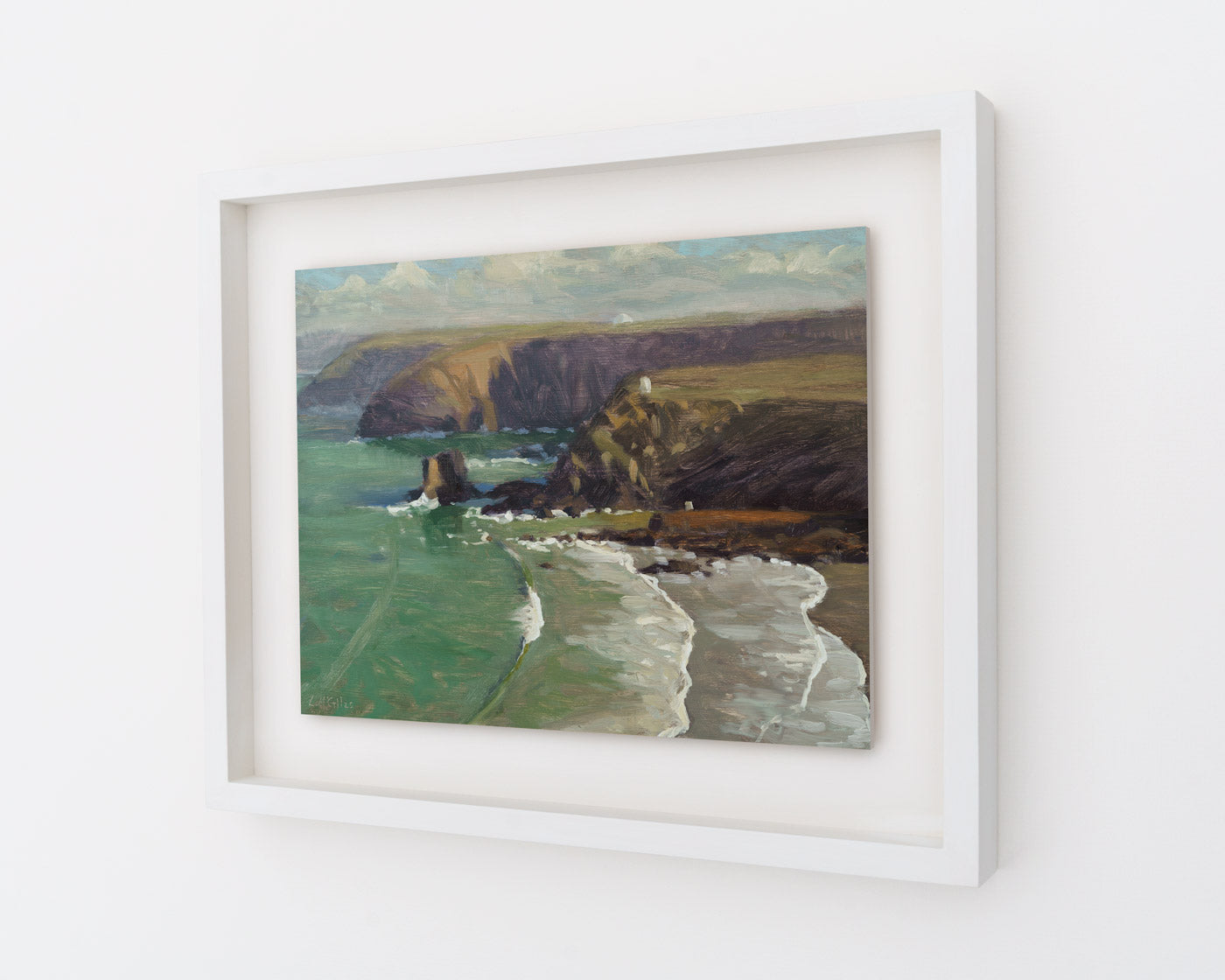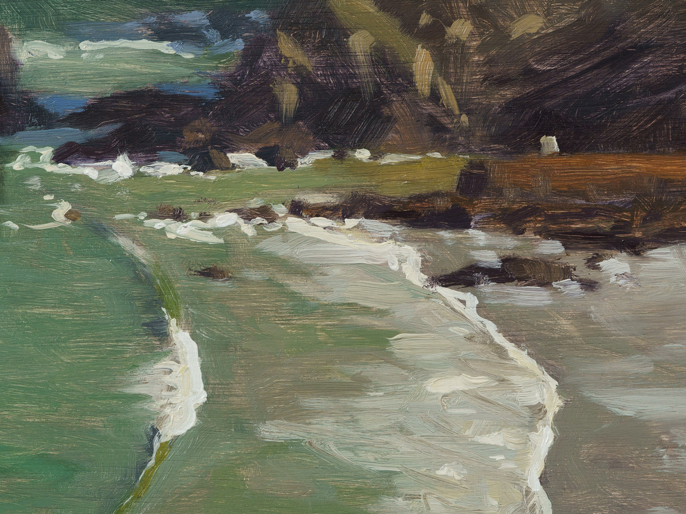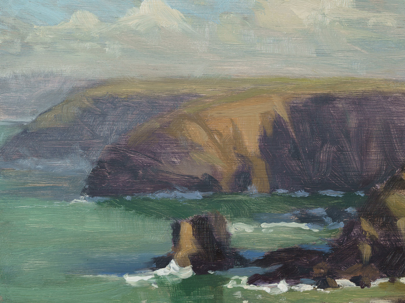 A clean swell rolls in at low tide, Portreath, Cornwall. The cliffs cast shadows in the morning light. Painted en plein air from the cliff top overlooking the beach.
